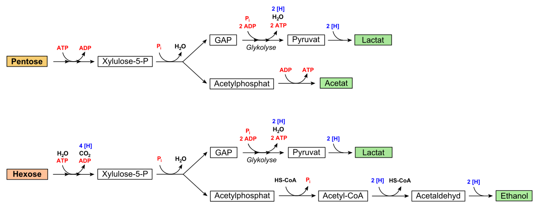 - heterofermentative Milchsäuregärung, bei der als Hauptendprodukte neben Milchsäure im Fall von Hexosen-Abbau Ethanol sowie Kohlenstoffdioxid, im Fall von Pentosen-Abbau Essigsäure gebildet werden,