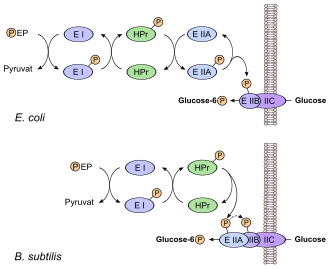 Der erste Reaktionsschritt besteht hierbei aus der Übertragung des Phosphatrests von PEP auf das unspezifische Enzym I (EI) durch Selbstphosphorylisierung, welches anschließend ein Histidin-haltiges Protein (HPr) an seinem Histidinrest phosphoryliert. EI und HPr sind entweder konstitutiv exprimiert oder teilweise induzierbar und befinden sich an den Zellpolen.[2] Erst die nun folgenden Übertragungsschritte auf den Enzymkomplex Enzym II (EII) sind substratspezifisch. Dieser ist aus mindestens drei Domänen (A bis C) aufgebaut, welche systemabhängig zu einem Komplex fusionieren oder separat im Cytoplasma der Zelle vorliegen können. Das eigentliche Transportprotein ist hierbei das Enzym II C, welches in die Membran integriert ist. Enzym IIB ist die einzige Komponente dieses Systems, die an einem Cysteinrest phosphoryliert wird; alle anderen Komponenten erfahren eine Übertragung auf einen Histidinrest. EII befinden sich an der Zellperipherie und werden durch die Anwesenheit des entsprechenden Zuckers exprimiert.[2] Zur Unterscheidung des Substrates verwendet man entsprechende dreibuchstabige Abkürzungen als hochgestellten Index; so bezeichnet man die glucosespezifische EIIA-Komponente EIIAGlc, eine manitolspezifische EIIC-Komponente dagegen EIICMtl.