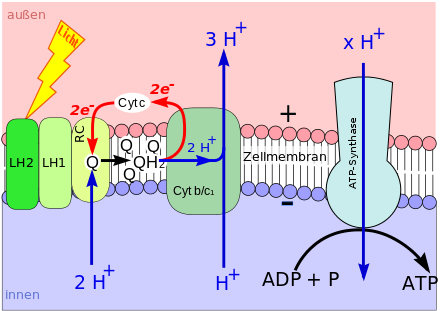Das Elektron wird über bestimmte weitere Moleküle fortgereicht (Elektronentransportkette), die ebenfalls in der Biomembran sitzen. Im Zuge des Elektronentransports werden Wasserstoffionen (Protonen, H+) von einer Seite der Biomembran auf die andere geschaufelt. Darum nimmt ihre Konzentration auf der einen Membranseite zu und gleichzeitig auf der anderen Seite ab. Auf diese Weise entsteht ein hohes H+-Konzentrationsgefälle zwischen beiden Membranseiten (Protonengradient).