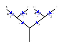 Für den Fall, dass die terminalen Taxa A und B jeweils noch eine Schwestergruppe hätten (A′ und B′), die ebenfalls jeweils Merkmal 1 aufwiese, wäre für die vier terminalen Taxa A bis B′ dieses Merkmal plesiomorph.