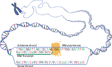 Schematische Darstellung der beiden DNA-Stränge während der Transkription (sense und antisense) und des entstehenden RNA-Transkripts