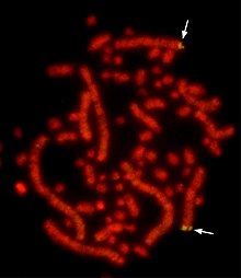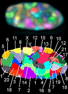 Nomenklatur: Um eine genaue Bezeichnung aller chromosomalen Regionen zu ermöglichen, wurden für den Menschen und einige andere Organismen standardisierte Bezeichnungssysteme eingeführt. Beim Menschen hat jede Bande eine Bezeichnung, die sich aus folgenden Elementen zusammensetzt: Nummer des Chromosoms, p oder q für den jeweiligen Arm (p wie franz. petite für den kurzen Arm; q wie franz. queue für den langen) sowie Zahlen, die vom Centromer aus aufwärts zählen. Zur feineren Unterscheidung können die Zahlen mehrere Stellen haben. Die Bande 3q26.31 ist demnach eine Unterbande von 3q26. Die Bezeichnung „3q“ steht entsprechend für den gesamten langen Arm des Chromosoms 3. Centromerregionen werden auch mit c bezeichnet (3c). Telomerbereiche werden der Einfachheit halber gerne mit tel (etwa 3ptel oder 3qtel) und telomernahe Bereiche mit ter (3pter) bezeichnet. Schematische Darstellungen der Standardbanden heißen Idiogramme. Beispiele sind in der Abbildung rechts und auf der Website von Ensembl zu sehen. In Idiogrammen sind G-Banden stets dunkel, R-Banden weiß eingezeichnet. Bereiche aus repetitiven Elementen werden manchmal schraffiert dargestellt. Eine sortierte Anordnung aller mitotischen Chromosomen aus einer Zelle wird als Karyogramm bezeichnet (Abbildung weiter unten). Der Karyotyp eines Lebewesens gibt an, wie viele und gegebenenfalls welche Chromosomen dieses Individuum hat. Der Karyotyp einer Frau wird als 46,XX angegeben, der eines Mannes als 46,XY (siehe unten, Geschlechtsbestimmung).