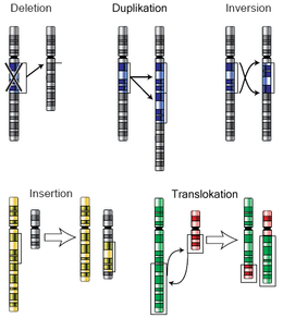 Dauerhafte Veränderungen an den Chromosomen können auftreten, wenn an mindestens zwei Stellen Brüche in der DNA-Doppelhelix auftreten. In den meisten Fällen werden DNA-Doppelstrangbrüche wieder korrekt repariert, so dass es nicht zu bleibenden Veränderungen kommt. Werden jedoch bei einer DNA-Reparatur von zwei verschiedenen Brüchen die falschen Enden zusammengefügt, so kommt es zu Chromosomenmutationen. Liegen die Bruchpunkte auf dem gleichen Chromosom, können Deletionen (Verlust eines Abschnitts) oder Inversionen (umdrehen) auftreten. Ein weiterer Mutationstyp innerhalb eines Chromosoms ist die Duplikation (Verdopplung eines Abschnitts). Sind die Doppelstrangbrüche auf verschiedenen Chromosomen, so kann es zu Translokationen kommen. Diese Phänomene werden in ihren eigenen Artikeln ausführlicher beschrieben.