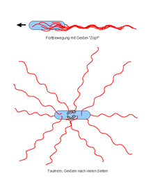- Prokaryoten besitzen gewendelte Proteinfäden außerhalb der Zellmembran, die sich nicht aktiv verformen, sondern an ihrem in der Zelle verankerten Ende durch einen Motor in Drehung versetzt werden und auf diese Weise – ähnlich wie ein Propeller – einen Schub oder Zug ausüben.