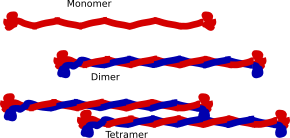 Ein einzelnes Monomer, die Untereinheit der Intermediärfilamente, ist etwa 48 nm lang und sehr dünn. Das Monomer hat an beiden Enden globuläre Domänen, die typspezifisch sind, also von Protein zu Protein verschieden sein können. Ein Coiled-Coil-Dimer besteht aus zwei parallelen, seilartig um sich selbst gewundenen Monomeren. Mehrere dieser Dimere lagern sich antiparallel und leicht verschoben durch nichtkovalente Bindungen aneinander zu Tetrameren. Viele dieser Tetramere bilden wiederum ein seilartiges Filament, mit einem Tetramer im Zentrum und sieben darum gewickelten Tetrameren mit einem gesamten Durchmesser von ca. 10 nm.