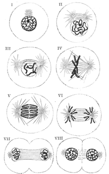 Auch dem Bonner Botaniker Eduard Strasburger fielen 1874 in einem Präparat sich teilender Zellen Teilungsstadien auf mit Kernspindeln anstelle eines normalen Zellkerns, in denen längliche, gekrümmte oder abgewickelte Fadengebilde sichtbar waren. Wegen ihrer starken Anfärbbarkeit nannte der Kieler Anatom Walther Flemming deren Substanz Chromatin und bezeichnete den gesamten Vorgang der indirekten Kernteilung 1879 als „Mitose“ (nach dem griechischen Wort für „Faden“). Zuvor hatte er an Zellen des Feuersalamanders festgestellt, dass sich jeder Faden in zwei parallele trennt, dass die neuen Kerne je aus der vollen Hälfte einer Spindel entstehen – und dass nichts übrig bleibt. Der Berliner Anatom Wilhelm Waldeyer schlug im Jahre 1888 die Bezeichnung Chromosomen vor. Bei genauerer mikroskopischer Untersuchung stellte man fest, dass jedes Chromosom aus zwei gleichen Hälften besteht, den Chromatiden. Diese liegen eng aneinander, sind aber nur an einer Stelle, dem Centromer, miteinander verbunden.