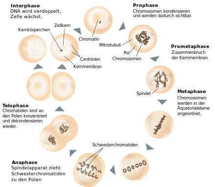 Im Zellzyklus sich teilender Zellen von Eukaryoten sind Kernteilung und Zellteilung aneinander gekoppelt. Mitose und Zytokinese werden so zusammen auch als Mitose- oder M-Phase bezeichnet. Während der Interphase zwischen einander folgenden Mitosen wird das DNA-Molekül eines Chromosoms verdoppelt (Replikation), wonach jedes Chromosom aus zwei gleichen Schwester-Chromatiden besteht. Bei der Mitose werden diese Chromatiden dann getrennt und aufgeteilt, sodass jeder Tochterkern je eine identische Hälfte als Tochterchromosom erhält. Damit kann an zwei Tochterzellen jeweils eine identische Kopie des gesamten chromosomalen Genoms der Mutterzelle weitergegeben werden.