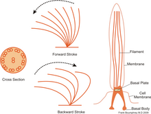 Kinozilien oder Wimpern sind sozusagen flexible Miniatur-Ruder, die im Gegensatz zu Geißeln uniplanar (in einer Ebene) schlagen. Ebene und Schlagrichtung liegen für jede Zilie fest. Während des kraftvollen Vorschlages ist die Zilie nahezu gestreckt. Der langsamere Rückschlag erfolgt gekrümmt, wobei eine Biegungswelle von der Zilienbasis bis zur Zilienspitze läuft und die Zilie bei geringem Widerstand des umgebenden Mediums wieder in ihre Ausgangsposition zurückgeführt wird. Dabei kann gleichzeitig eine Kurve im Raum durchlaufen werden.
