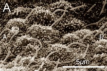 - Solche werden auch Kinozilien, Flimmerhärchen oder Wimpern genannt und mit den ähnlich aufgebauten, etwas längeren Geißeln der Eukaryonten als Undulipodien („wellenschlagende Füßchen“) zusammengefasst. Während einzelne Zellen durch Bewegungen ihrer Geißeln sich selber fortbewegen, bewegen miteinander verbundene Epithelzellen mittels ihrer Flimmerhärchen in abgestimmter Aktion beispielsweise Flüssigkeiten in den Bronchien oder ein Ei im Eileiter über die Epithelfläche.
