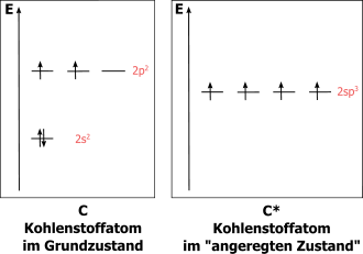 Allerdings muss hier berücksichtigt werden, dass es auch Elemente gibt, die durch Hybridisierung mehr Bindungen zur Verfügung stellen, so dass hier die Zahl der einfach besetzten Hybridorbitale zählt. Ein Beispiel dafür ist der Kohlenstoff, der im Grundzustand aufgrund seiner zwei einfach besetzten p-Orbitale (1s2, 2s2, 2p2) zweibindig wäre. Allerdings wird der Kohlenstoff vor der Bindung zu dem Valenzzustand (1s2, 2sp3) angeregt, in dem 4 einfachbesetzte sp3-Orbitale vorliegen, so dass er vier Bindungen eingehen kann, also vierbindig ist.