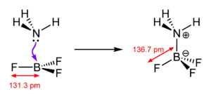 Ein typisches Beispiel ist Ammoniak (NH3), das sein freies Elektronenpaar für eine koordinative Bindung zur Verfügung stellt, siehe H3N-BF3 in nebenstehender Skizze. Formal gibt dadurch der Stickstoff ein Elektron dem Bor, wodurch ersterer (allgemein: der Donator) eine formale positive, letzteres (allgemein: der Akzeptor) eine formal negative Ladung erhält. Man beachte, dass diese formalen Ladungen nichts mit der tatsächlichen Ladungsverteilung zu tun haben: Da Stickstoff eine wesentlich höhere Elektronegativität als Bor besitzt (3,0 gegenüber 2,0) ist die Bindung zum Stickstoff hin polarisiert.