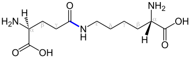 Nε-γ-L-Glutamy-L-lysin enthält eine Isopeptidbindung. Die Verknüpfung erfolgt bei der Glutaminsäure über die endständige Carboxygruppe und beim Lysin über die endständige Aminogruppe.