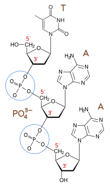 Phosphodiesterbindungen bilden den Zusammenhalt im Rückgrat von DNA und RNA. Die Nukleotide, aus denen diese aufgebaut sind, tragen dabei zunächst nur am Kohlenstoffatom C5 der zugrunde liegenden Pentose einen Phosphorsäurerest, der chemisch betrachtet einen Ester der Phosphorsäure mit der alkoholischen OH-Gruppe an diesem C-Atom darstellt. Bei der Kettenverlängerung im Zuge der Transkription der RNA bzw. der Replikation der DNA wird ausgehend vom vorhandenen Phosphorsäurerest eine zweite Esterbindung mit der OH-Gruppe am Kohlenstoffatom C3 von Ribose bzw. Desoxyribose geschlossen, wodurch die 3′-5′-Phosphodiesterbindung entsteht.