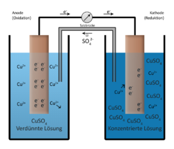 Ein Beispiel ist ein Kupfer-Konzentrationselement aus zwei Kupferelektroden und zwei Kupfersulfatlösungen, die sich nur in der Konzentration unterscheiden. Bei Stromfluss gleichen sich dann die Konzentrationen in den Zellen an, denn es laufen dann folgende Reaktionen ab: