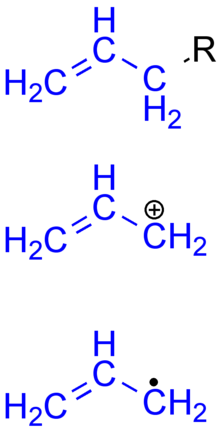 Allyl-Kation (Mitte) und Allyl-Radikal (unten). Der Allyl-Rest ist blau markiert.