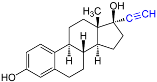 Ethinylgruppe (blau markiert) als Teil eines großen Moleküls (Arzneistoff
