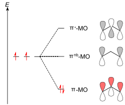 In der MO-Theorie werden n Atomorbitale zu n Molekülorbitalen kombiniert (LCAO-Methode). Bei einer ungeraden Anzahl an zu kombinierenden p-AOs ergeben sich (n-1)/2 bindende, (n-1)/2 antibindende und ein nichbindendes MO. Dies wird hier am Beispiel des Propenylkations demonstriert (Abb. 2). Alle drei p-AOs besitzen hier dieselbe Energie. Diese dürfen auf drei unterschiedliche Arten kombiniert werden, so dass drei Molekülorbitale resultieren. Die Elektronen populieren nach dem Besetzungsprinzip das MO mit der niedrigsten Energie.