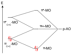 Eine im Ergebnis gleiche Alternative ist zwei Atomorbitale zu einem π- und einem π*-Orbital zu kombinieren und diese beiden mit dem verbliebenen p-Atomorbital zu den drei Molekülorbitalen zu kombinieren (Abb. 3). In dieser Vorgehensweise lässt sich die Konjugationsenergie erkennen, die das Molekül im Vergleich zu einer isolierten Doppelbindung und einem isolierten Elektronensextett am Kohlenstoff stabilisiert: sie beträgt den doppelten (da zwei Elektronen) energetischen Abstand des πC=C-Orbitals zum π-MO des Moleküls.