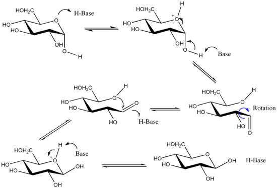 Ursache ist, dass Aldopentosen, Aldohexosen und längerkettige Kohlenhydrate (Zuckermoleküle mit einer Aldehydgruppe und fünf, sechs bzw. mehr Kohlenstoffatomen) in wässriger Lösung im Wesentlichen nicht offenkettig, sondern ringförmig als Halbacetal vorliegen, d.h., die Aldehydgruppe geht eine Bindung mit der vorletzten Hydroxygruppe ein. Hier entsteht ein neues Chiralitätszentrum und zwei mögliche Isomere (genauer: Diastereomere), das α- oder β-Anomer, die sich entsprechend auch in ihrem optischen Drehwinkel unterscheiden. Nun liegt die offenkettige Form mit der Ringform in einem dynamischen Gleichgewicht, das allerdings sehr auf Seiten der Ringform liegt. Weil bei jeder Ringbildung die α- oder β-Form entstehen kann, liegen also auch diese beiden in einem Gleichgewicht mit einer ganz bestimmten Konstante. Eine solche chemische Umwandlung, bei der die Konfiguration nur eines stereogenen Zentrums eines Diastereomers geändert wird, bezeichnet man als Epimerisierung. Findet im Falle von Kohlenhydraten eine Epimerisierung am anomeren Zentrum statt, spricht man auch von Anomerisierung.