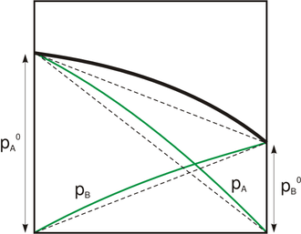 In dem rechts dargestellten Fall ist der Gesamtdruck nur etwas größer als nach dem Raoult'schen Gesetz berechnet. Die meisten realen Gemische zeigen ein stärker nach oben oder unten abweichendes Verhalten.