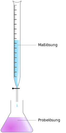 Mit einer Bürette wird zu einer Probelösung (Titrand) ein Reagenz bekannter Konzentration (die Maßlösung, auch Titrator, Titrant oder Titrans genannt), hinzugetropft, bis die Äquivalentstoffmenge erreicht ist (auch Äquivalenzpunkt oder Endpunkt genannt). Die Endpunkterkennung kann hierbei vielfältig mit chemischen und physikalischen Methoden erfolgen und unterscheidet auch die verschiedenen Titrationsarten. An der Bürette kann das verbrauchte Volumen abgelesen werden. Vor Beginn der eigentlichen Titration wird der Gehalt (Stoffmengenkonzentration c in [mol/l]) der Maßlösung genau bestimmt und ein Korrekturfaktor, der sogenannte Titer, ermittelt, um die Genauigkeit der Messung zu erhöhen.