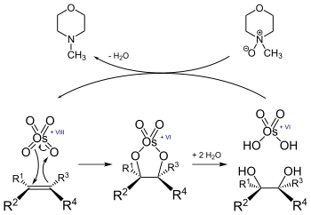 Der Mechanismus für die Dihydroxylierung ist für Osmiumtetroxid als Oxidationsreagenz umfangreich untersucht und bestätigt. Es wird angenommen, dass Permanganat und Rutheniumtetroxid analog reagieren. Die Reaktion beginnt mit einer 1,3-dipolaren Cycloaddition des Oxidationsmittels an die Doppelbindung. Der entstandene fünfgliedrige Ring ist ein Diester der Osmium(VI)-säure, welcher in Anwesenheit von Wasser gespalten (hydrolysiert) wird und das Endprodukt freisetzt. Aufgrund des Fünfringintermediats entsteht ausschließlich das cis-Additionsprodukt. Die entstandene Osmium(VI)-säure OsO2(OH)2 wird anschließend durch NMO wieder in das achtwertige Osmiumtetroxid überführt.