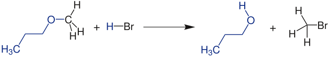 Ist die Stabilisierung eines Carbokations nicht möglich, wird der bimolekulare, konzertierte SN2-Mechanismus durchlaufen. Hier wird der Ether-Sauerstoff im Methyl-n-propylether reversibel protoniert, woraufhin das Bromid- (bzw. Halogenid-)Ion das sterisch weniger gehinderte Kohlenstoffatom unter Bildung von Methylbromid nukleophil angreift und gleichzeitig 1-Propanol freigesetzt wird.