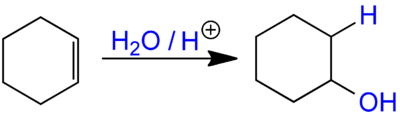 Hier als Beispiel die Reaktion von Cyclohexen zu Cyclohexanol, mit Schwefelsäure als Katalysator.