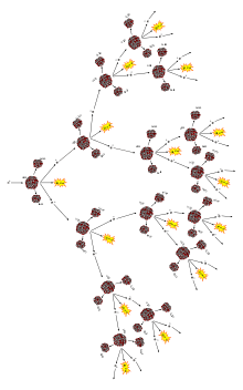 Das Bild zeigt schematisch eine Spaltungs-Kettenreaktion mit schnell zunehmender Reaktionsrate, hier: Verdoppelung in jeder Generation. (Die Richtung von links nach rechts stellt nur den zeitlichen, nicht den räumlichen Ablauf dar. In Wirklichkeit bewegen sich die freigesetzten Neutronen in einem Spaltmaterial enthaltenden Raum in alle Raumrichtungen.)