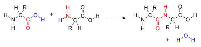 Ein Beispiel für die Kondensationsreaktion ist die enzymkatalysierte Reaktion zweier Aminosäuren zu einem Dipeptid nach folgendem Reaktionsschema:
