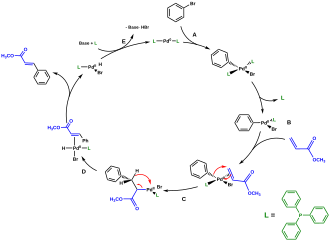 Der Katalysezyklus beginnt mit der oxidativen Addition (A) des Halogenids an die Palladium(0)-Spezies, wobei formal ein Palladium(II)-Komplex gebildet wird, der dann über einen π-Komplex in die Alken-Komponente insertiert (C). Aus der Pd(II)-σ-Zwischenstufe wird zunächst das Alken unter β-Hydrid-Eliminierung (D) abgespalten, dann wird durch eine reduktive Eliminierung (E) von HX aus die Pd(0) Spezies zurückgebildet. Das freigesetzte HX wird durch die Base gebunden.