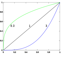 In der Grafik sind drei Beispielkurven eingezeichnet für γ=3, 0,3 und 1.