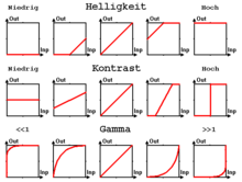 Wird die Korrekturfunktion mit einem Koeffizienten k multipliziert (A=k\cdot E^{\gamma }), ergibt sich daraus zusätzlich zu der eigentlichen Gammakorrektur noch eine Kontrasterhöhung (k>1) bzw. -verminderung (k<1), bei Hinzufügen einer additiven Konstante h dagegen (A=E^{\gamma }+h) über die Gammakorrektur hinaus eine Helligkeitserhöhung (h>0) bzw. -verminderung (h<0). In der Praxis führen so allein schon die beiden eben genannten zusätzlichen Optionen schnell zu einer verwirrenden Vielfalt von Korrekturmöglichkeiten – die obige Abb. rechts zeigt daher noch einmal separat das jeweils Charakteristische der Helligkeits-, Kontrast- und Gammawertkorrektur.