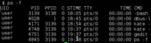 - ↑ Anmerkung: ps ohne Optionen zeigt nur solche Prozesse an, die aus Textkonsolen bzw. Shell-Fenstern gestartet wurden. Durch die Option x werden auch Prozesse angezeigt, denen kein Terminal zugeordnet ist. Außerdem gibt es das Kommando top: Dieses ordnet die Prozesse danach, wie sehr sie die CPU belasten und zeigt die gerade aktiven Prozesse zuerst an.