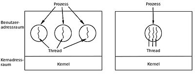 Ein Thread-Paket auf Benutzerebene (links) und ein Thread-Paket vom Betriebssystem-Kern verwaltet (rechts)