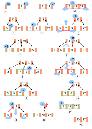 - a–c) Einfügen von 5, 13 und 27 in einen anfangs leeren Baum.