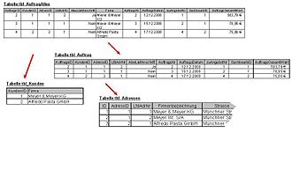 Bei einer normalisierten Datenbank gibt es für die Kundendaten nur einen einzigen Eintrag in der Kundentabelle, mit der jeder Auftrag dieses Kunden verknüpft wird (üblicherweise über die Kundennummer). Im Falle des Umzugs eines Kunden (ein anderes Beispiel ist die Änderung der Mehrwertsteuer) gäbe es zwar mehrere Einträge in der entsprechenden Tabelle, die aber zusätzlich durch die Angabe eines Gültigkeitszeitraums unterscheidbar sind und im obigen Kundenbeispiel über die Kombination Auftragsdatum/Kundennummer eindeutig angesprochen werden können.