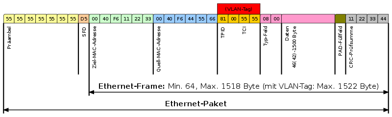 Der VLAN-Tag wird als Folge von zwei Bytes „81 00“ übertragen. Die 16 Bit des TCI werden in gleicher Weise Big-Endian mit dem höheren Byte voran verschickt.