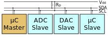 Im Diagramm rechts sind drei Geräte eingezeichnet. I²C benötigt zwei Signalleitungen: Takt- (SCL = Serial Clock) und Datenleitung (SDA = Serial Data). Beide liegen mit den Pull-up-Widerständen RP an der Versorgungsspannung VDD. Sämtliche daran angeschlossene Geräte haben Open-Collector-Ausgänge, was zusammen mit den Pull-up-Widerständen eine Wired-AND-Schaltung ergibt. Der High-Pegel soll mindestens 0,7 × VDD betragen, und der Low-Pegel soll bei höchstens 0,3 × VDD liegen. Die im Bild nicht eingezeichneten Serienwiderstände RS an den Eingängen der Geräte sind optional und werden als Schutzwiderstände verwendet. Der I²C-Bus arbeitet mit positiver Logik, d.h. ein High-Pegel auf der Datenleitung entspricht einer logischen „1“, der Low-Pegel einer „0“.