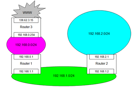 Gegeben sei ein LAN mit drei Subnetzen und einem Zugang ins Internet. Um die Netze miteinander verbinden zu können, werden drei Router eingesetzt: