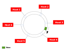 Ein Token kreist bei Token-Ring-Netzen über den Ring: Das Token wird stets von einem Knoten an den nächsten weitergereicht. Selbst im Leerlauf geben die Stationen das Paket fortwährend weiter.