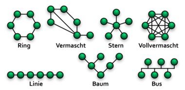 Netzwerktopologien: Ring, Vermaschtes Netz, Stern, vollvermascht, Linie/Reihe, Baum, Bus