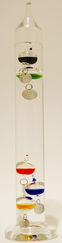 Ein Galileo-Thermometer zeigt anhand des Auftriebs verschiedener Körper in einer Flüssigkeit die Temperatur der Flüssigkeit an. Die dazu verwendeten Glaskugeln, deren Durchmesser größer ist als der halbe Innendurchmesser des Zylinders (wodurch sie in der Schichtung bleiben und sich gegenseitig nicht "überholen"), wurden mithilfe von Flüssigkeiten so austariert, dass deren mittlere Dichte von der obersten Kugel zur untersten Kugel zunimmt. Da die Dichte der Flüssigkeit temperaturabhängig ist, ändert sich der Auftrieb entsprechend der Temperatur. Bei einer bestimmten Temperatur steigen alle Kugeln auf, deren mittlere Dichten kleiner sind als die mittlere Dichte der sie umgebenden Flüssigkeit ist. Alle Kugeln sinken ab, deren mittlere Dichten größer sind als die mittlere Dichte der sie umgebenden Flüssigkeit. Die aktuelle Temperatur kann an der angehängten Plakette der oben zuunterst schwimmenden Kugel abgelesen werden. Erwärmt sich dann die Flüssigkeit, nimmt also ihre Dichte ab, so sinkt eine weitere Kugel ab und die neue Temperatur kann wieder an der angehängten Plakette der oben zuunterst schwimmenden Kugel abgelesen werden.