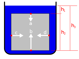 Die Auftriebskraft eines in einem Fluid eingetauchten Körpers kommt daher, dass der Druck eines Fluides im Schwerefeld, der sogenannte hydrostatische Druck, mit der Tiefe zunimmt, also bei jedem ausgedehnten Körper „unten“ und „oben“ verschieden groß ist. Taucht beispielsweise ein quaderförmiger Körper mit seiner Grundfläche in ein Fluid ein, so ist der hydrostatische Druck an der Grundfläche (im Bild als b gekennzeichnet) größer als an der Oberseite (a). Bei unregelmäßiger geformten Körpern ist die statische Auftriebskraft die resultierende Kraft aus den (vertikalen) Kraftanteilen der hydrostatischen Drücke, die an allen Oberflächenteilen angreifen.