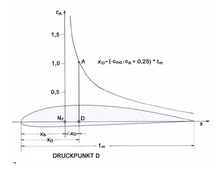 An gewölbten Flügelprofilen ändert der Druckpunkt je nach Anstellwinkel seine Position in Strömungsrichtung: er wandert auf der Profilsehne nach vorne, wenn der Anstellwinkel erhöht wird. Bei einer DP-Position hinter dem Viertelpunkt der Profiltiefe bewirkt jede Anstellwinkelerhöhung eine aufstellende Drehmomentänderung (Nase nach oben).