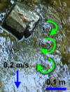 Die Animation (rechts) zeigt, wie sich Wirbel an einem Hindernis bilden, ihr Mitfließen mit der Strömung und ihre Rotation hin zum Hindernis.