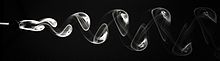 Hinter einem zügig mit der Hand durch die Luft bewegtem Räucherstäbchen ist eine Kármánsche Wirbelstraße ähnlich der Abbildung oben rechts zu beobachten.