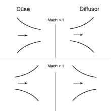 Befindet sich das Fließmedium selbst in Überschallgeschwindigkeit und soll es auch in Überschallgeschwindigkeit verbleiben (z.B. im Lufteinlass eines Pulsertriebwerkes), dann muss sich die Düse in Fließrichtung weiten, nicht verjüngen. Im Artikel Düse wird dieses paradoxe Phänomen erklärt.