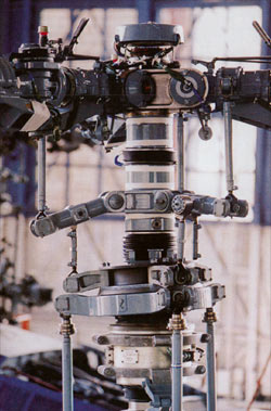1. Obere Rotornabe 2. Untere Rotornabe 3. Obere Taumelscheibe 4. Untere Taumelscheibe 5. Getriebe des Rotorsystems 6. Klappscharnier 7. Schleppscharnier 8. Federscharnier 9. Schaufel 10. Obere Rotorwelle 11. Untere Rotorwelle 12,13. Stangen 14,15. Schelle 16. Oberer Taumelscheibenring 17. Verbindungsring 18. 19. Antriebselemente 20. Unterer Taumelscheibenring 21. Axiallager 22. Rolle |