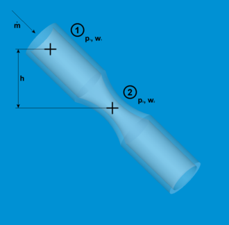 Die Druckdifferenz ist bei idealen Flüssigkeiten (inkompressibel und reibungsfrei) durch die Bernoulli-Gleichung gegeben. Bei idealen Gasen gilt die erweiterte Bernoulli-Gleichung.